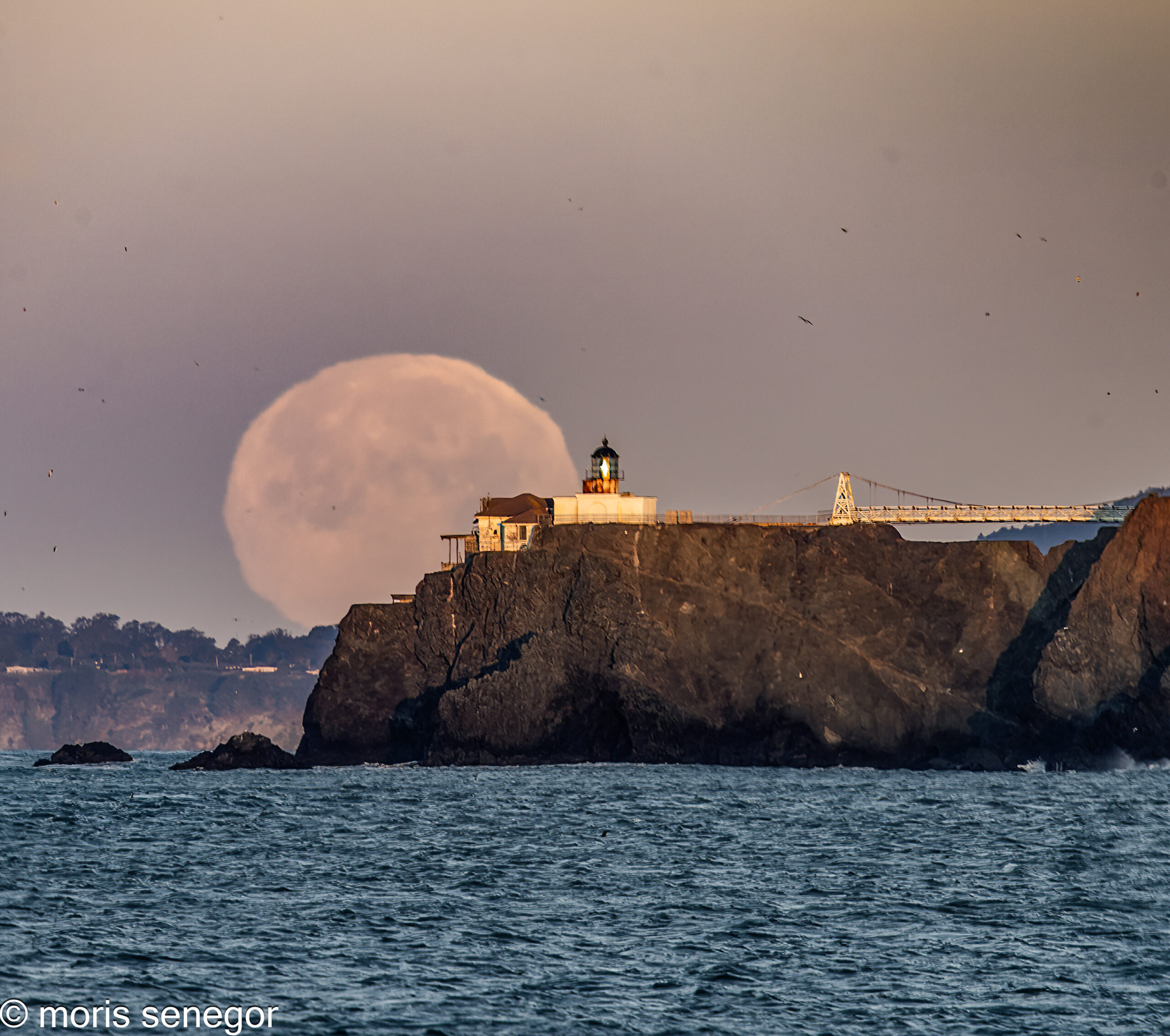 Moonset at horizon. Point Bonita Lighthouse, Golden Gate.