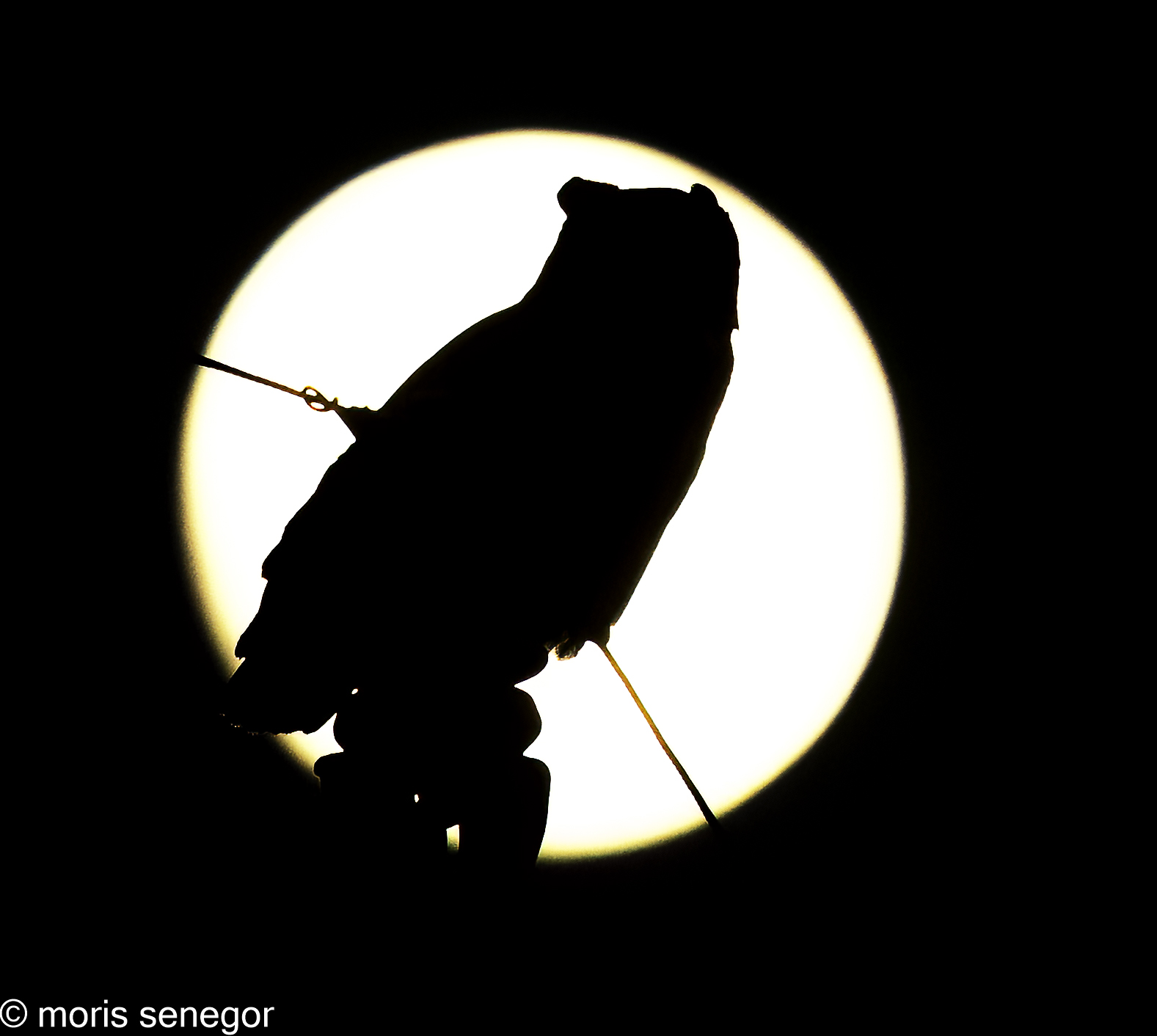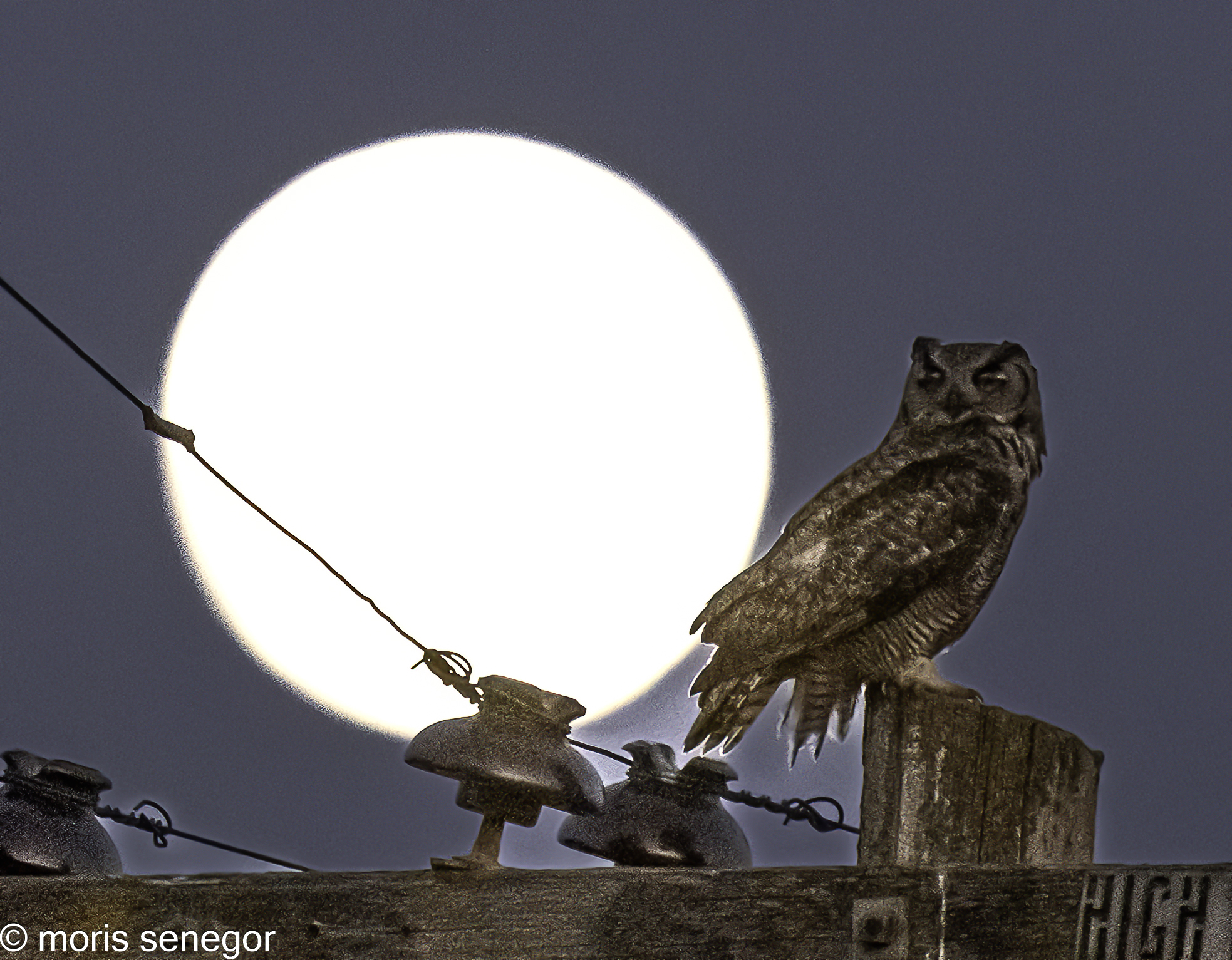 Great horned owl with a full moon background. Not good picture. It took an effort to turn it to the more dramatic one below.