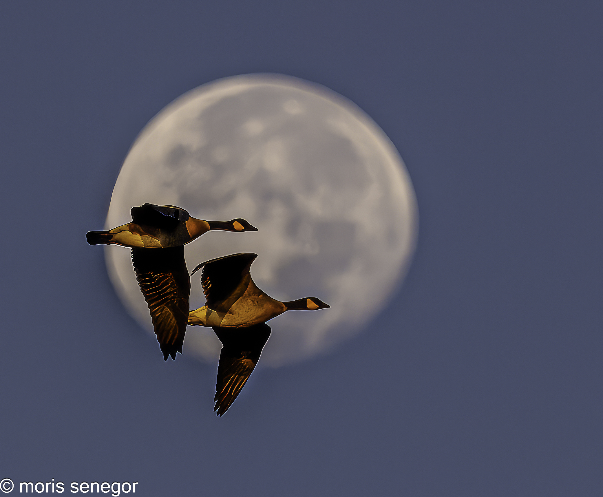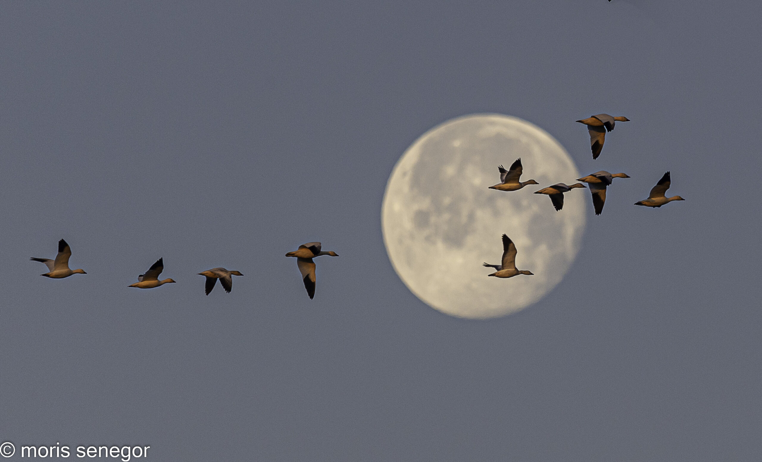 Geese by full moon, at moonrise.